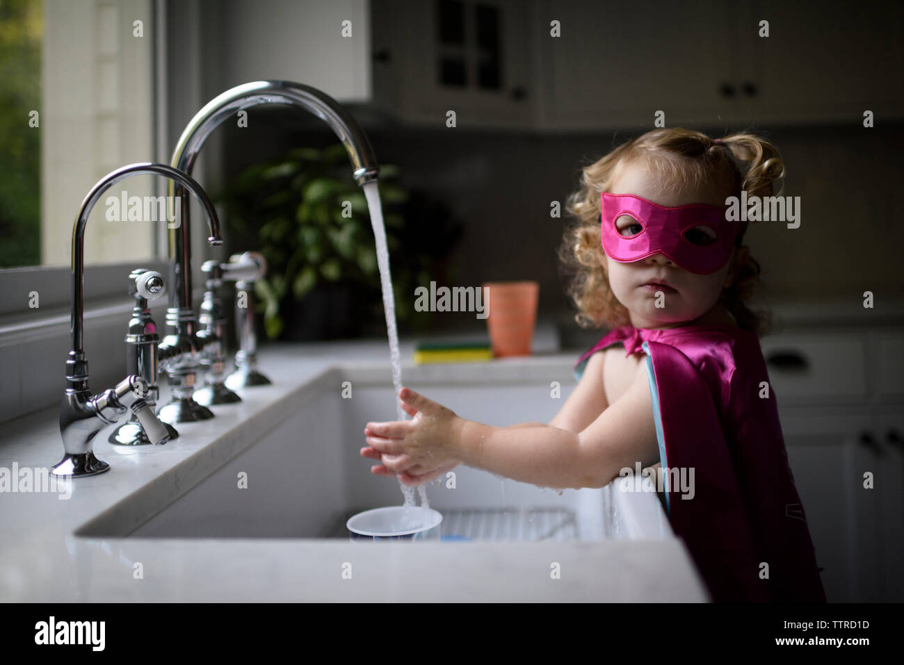 Portrait Of Girl Wearing Superhero Costume Washing Hands In